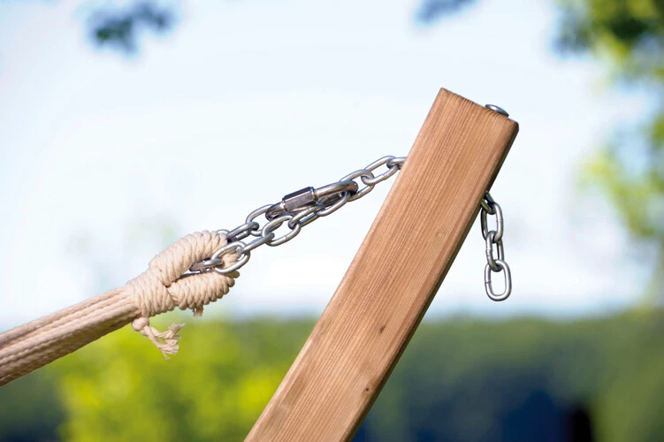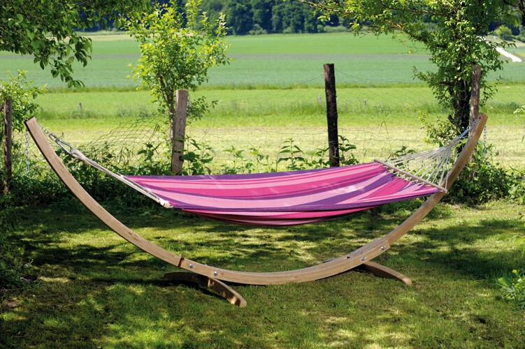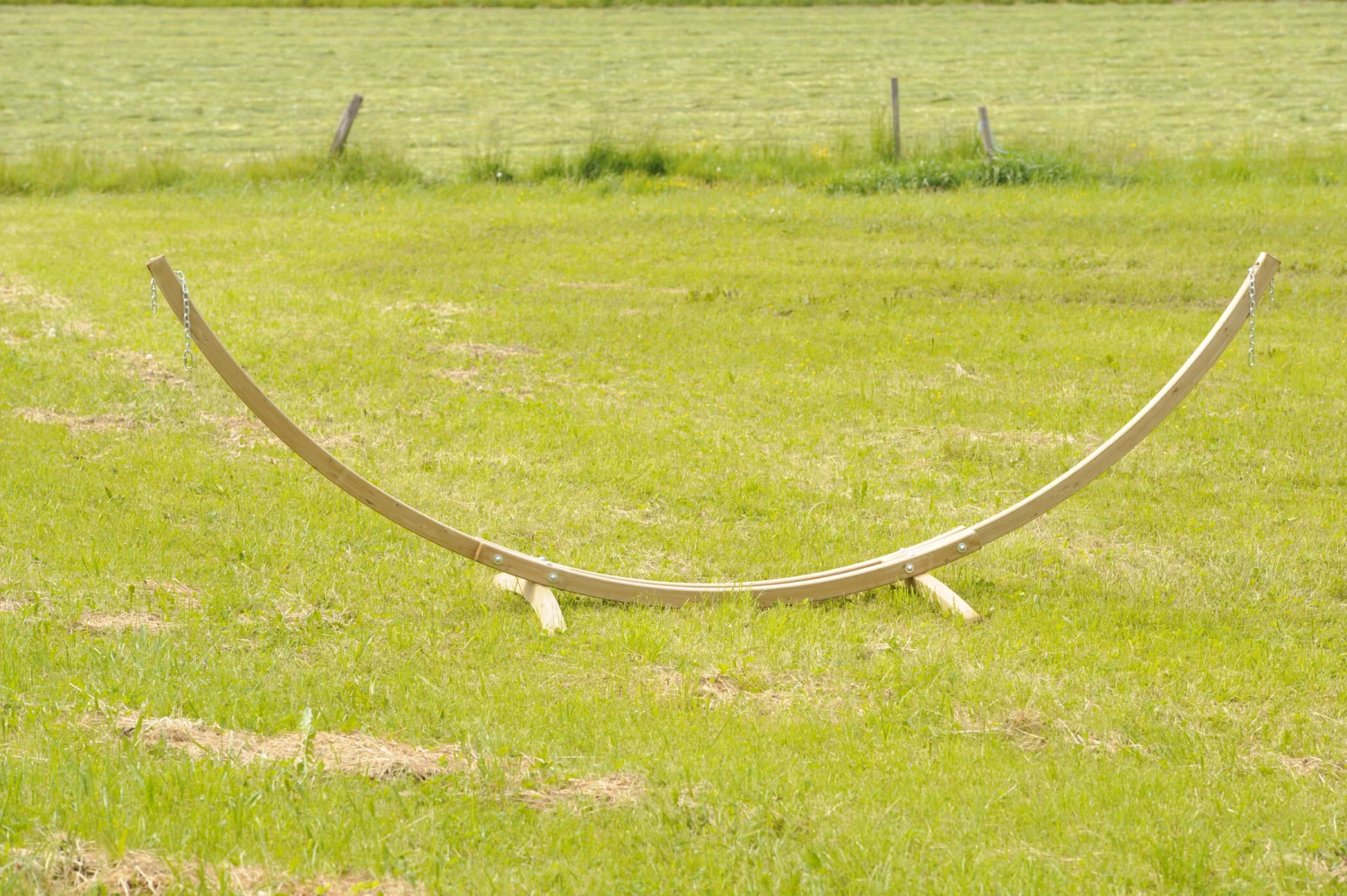 Magnifique ensemble de hamacs, composé d’un cadre en bois soigneusement stratifié et d’un hamac en forme de bâton. Parfait pour le jardin. Peut se passer complètement des arbres et est sans danger.