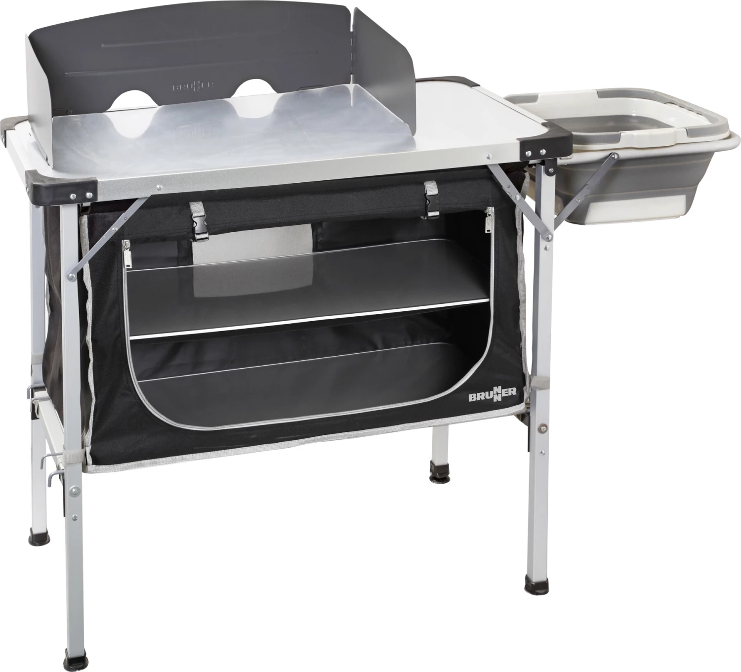 Boîte de cuisine avec un cadre en aluminium très solide et un grand plan de travail en MDF avec un bord en aluminium sur tout le pourtour. La boîte de cuisine est entièrement emballée dans le sac de transport fourni. Facile à monter et à démonter. Le grand placard avec porte à fermeture éclair offre un espace de rangement généreux pour la nourriture et les ustensiles de cuisine. Avec un cadre latéral rabattable pour un évier de travail pliable.
