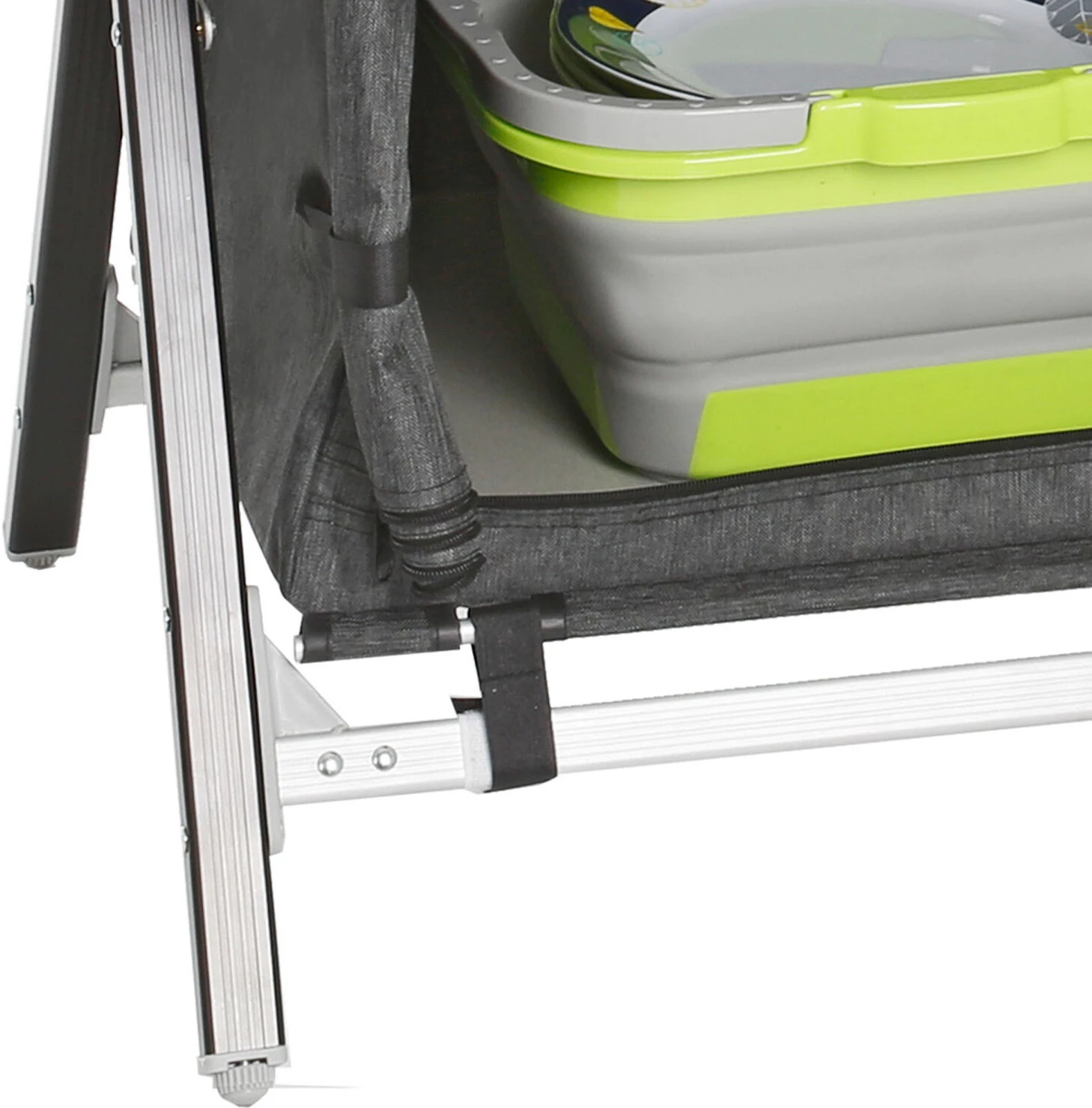 Boîte de cuisine pratique avec cadre CROSS en profil rectangulaire d’aluminium et joint central en métal. Tous les pieds sont réglables en hauteur. Avec 2 étagères intérieures et un plan de travail supérieur en bambou. Système sans montage. Pare-brise et sac de transport inclus.