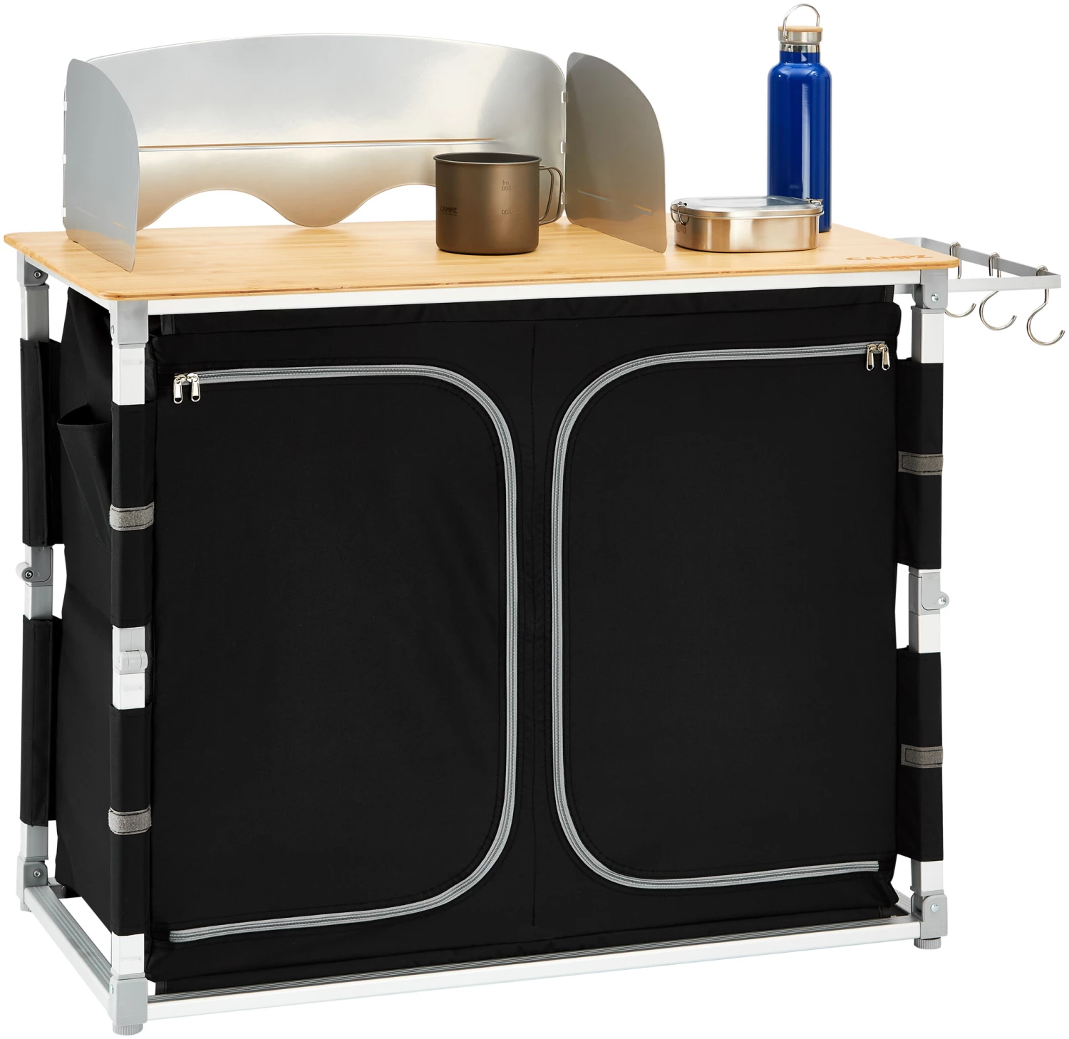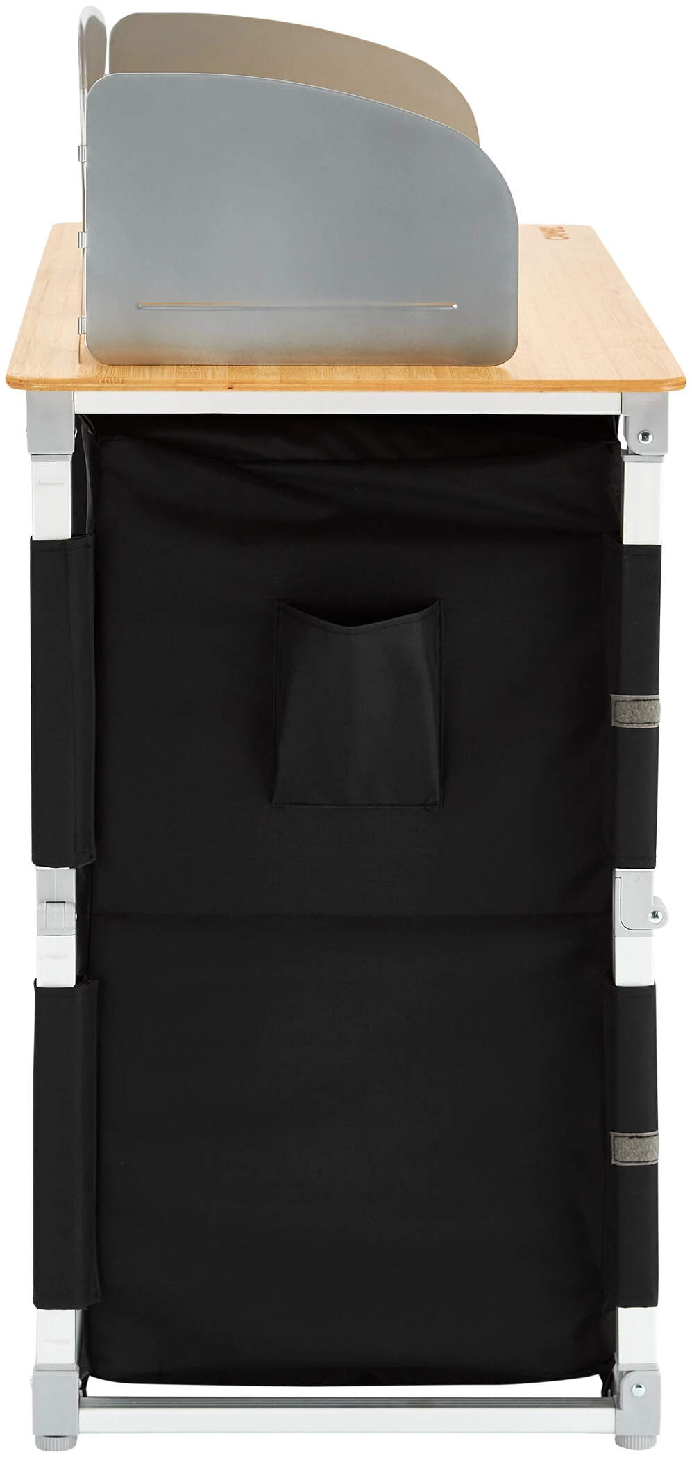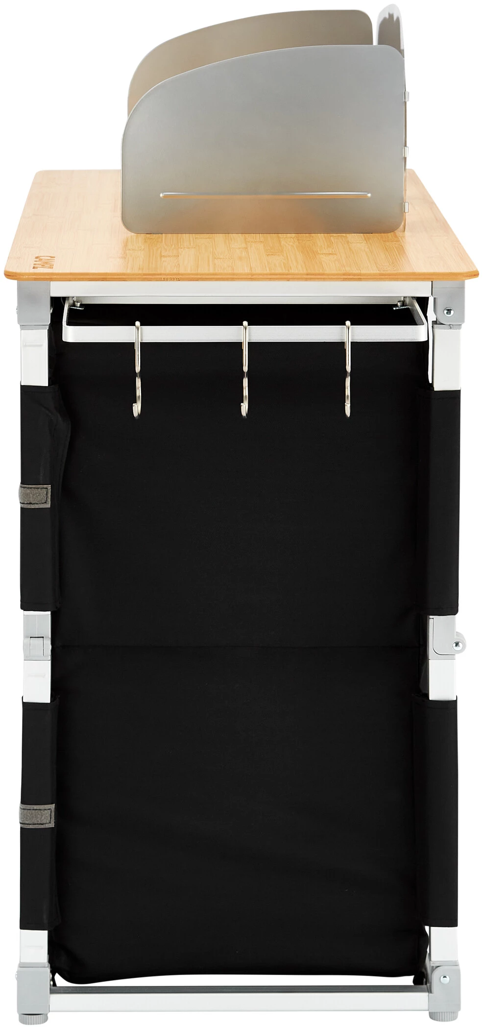 Cette cuisine de camping pratique est prête à l’emploi en quelques secondes grâce à un système de montage rapide et confortable. Elle est dotée d’un plan de travail en bambou, d’une structure légère en aluminium, d’une housse en polyester Oxford très robuste et d’étagères en panneaux MDF stables.