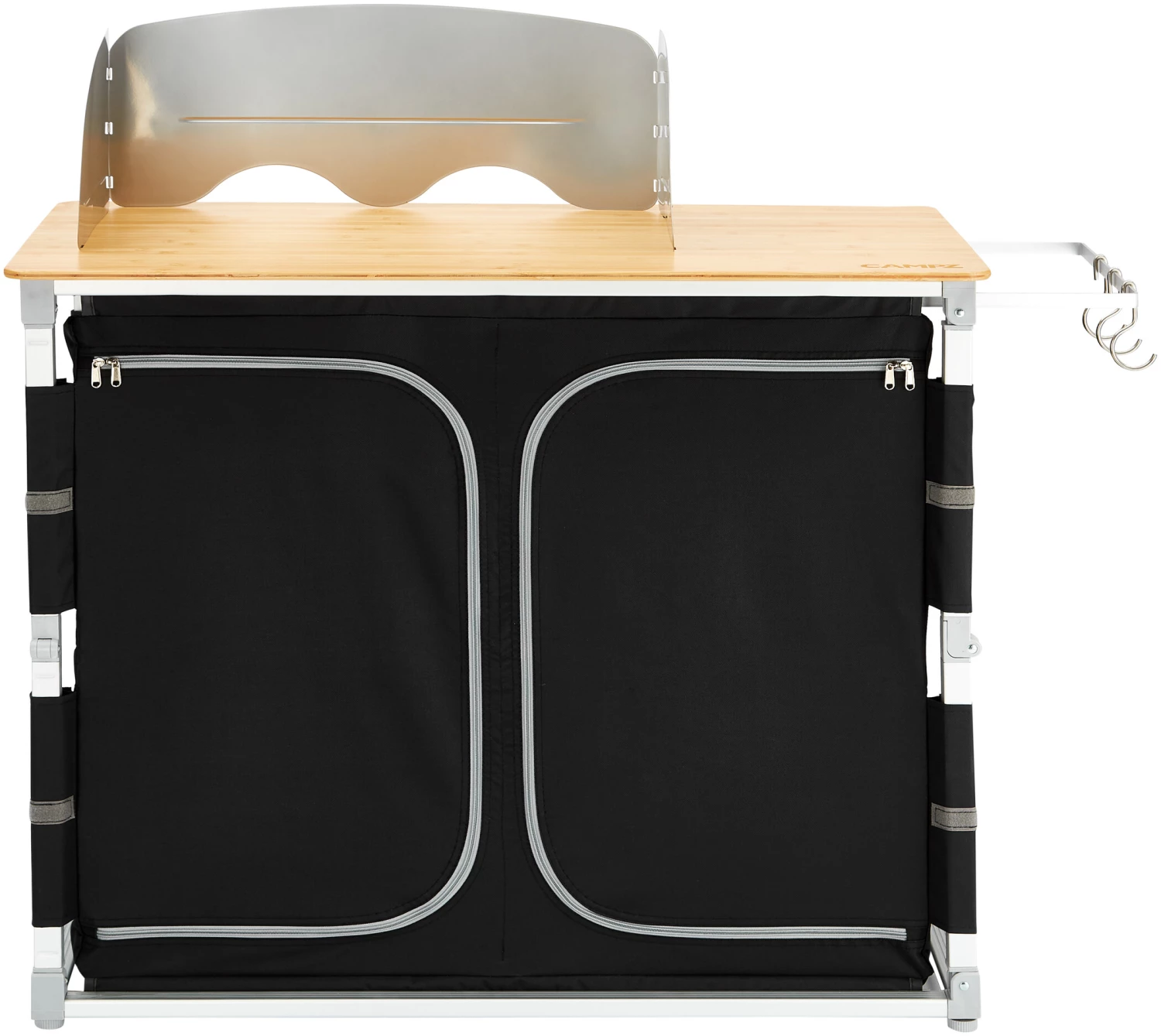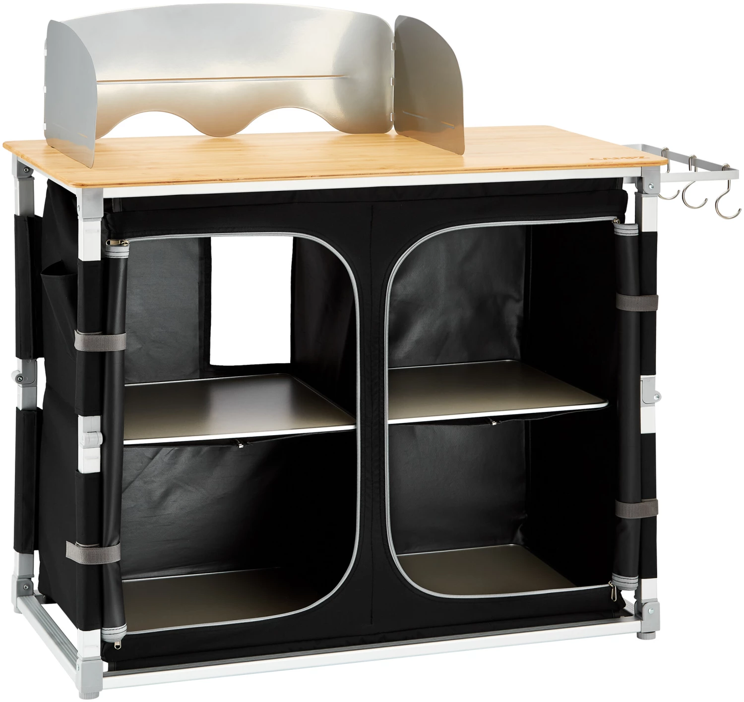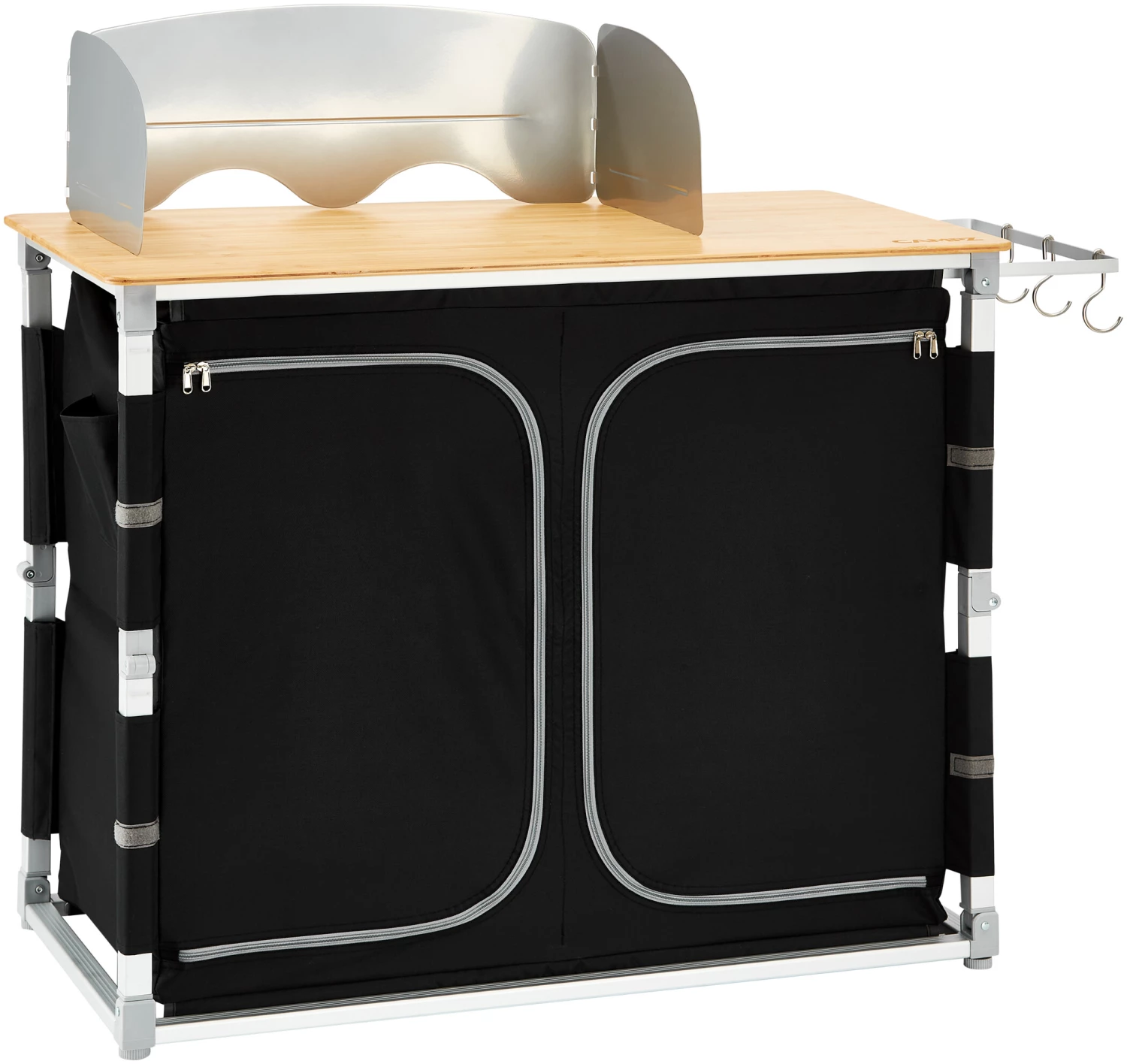 Cette cuisine de camping pratique est prête à l’emploi en quelques secondes grâce à un système de montage rapide et confortable. Elle est dotée d’un plan de travail en bambou, d’une structure légère en aluminium, d’une housse en polyester Oxford très robuste et d’étagères en panneaux MDF stables.